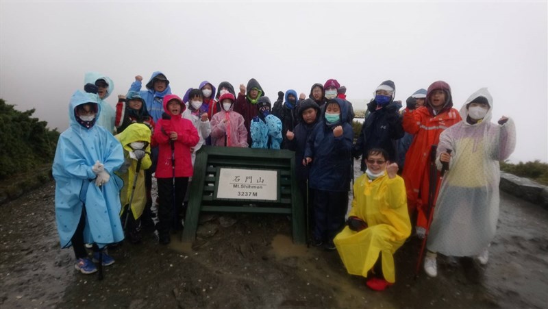 34名師生23日出發,今天原定登山時間,因合歡山雨勢不斷、山上雲霧山嵐繚繞,經改變登山路徑,感受到石門山的山勢和緩、山頂平坦開闊許多,即使山上溫度只有攝氏6度,寒風瑟瑟,小朋友不畏冷冽的天候仍展現攻頂的強烈企圖心,終於上午10時許成功挑戰石門山並攻頂。