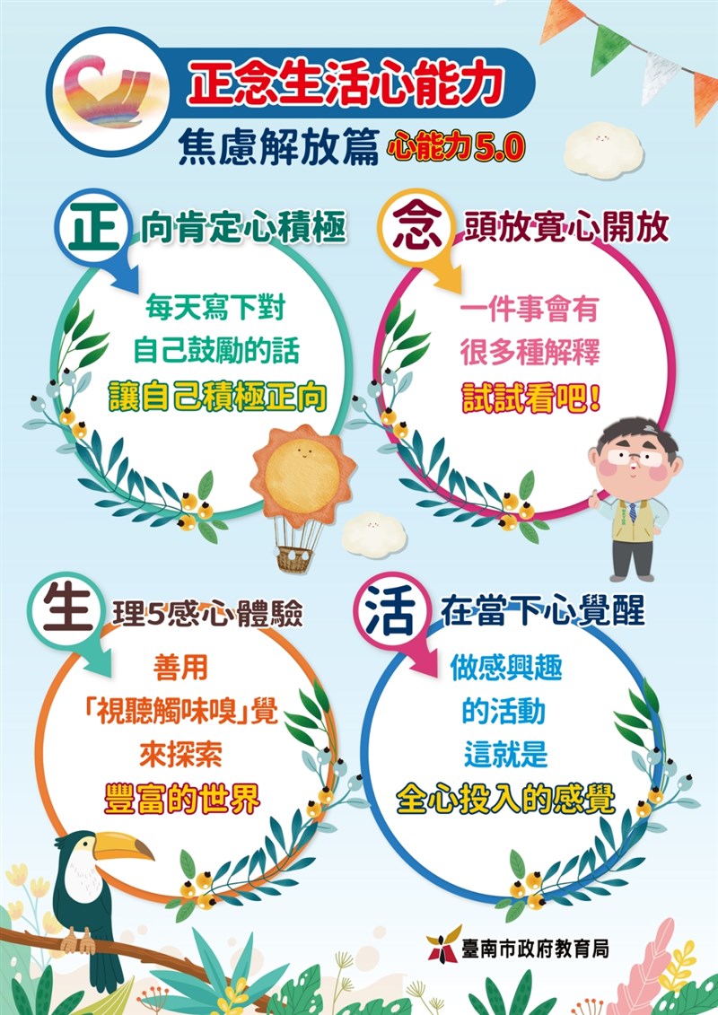市長黃偉哲表示,為協助學生情緒正向發展,除了請教育局、輔諮中心及學校,共同建構緊密的三級輔導工作外,針對學校教師輔導需求也製作系列輔助圖卡。此次主題為「正念生活」,包括「正」向肯定心積極、「念」頭放寬心開放、「生」理5感心體驗、「活」在當下心覺醒,透過4方向規畫與設計活動學習單,提供學校實際運用。