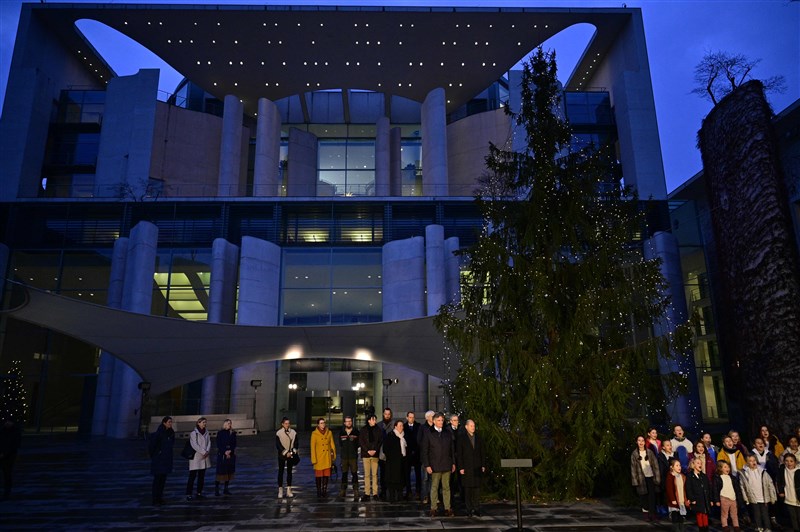 德國總理蕭茲(Olaf Scholz)辦公室外的耶誕樹點亮的時間將縮短,只在每天傍晚4時到8時點亮4小時。圖/法新社