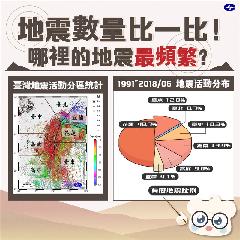 「報地震 - 中央氣象局」說,每年在台灣觀測到的地震大約2萬多到4萬多次之間,有感地震則有700至2000多次。台灣各地地震活動比例差異很大,以有感地震為例,在1991-2018年的數據中,花蓮地區就占48.7%,台灣有將近一半的有感地震都在花蓮發生,台北地區卻只有0.7%