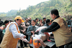 儀式結束後,賑災隊於分三組六小隊,由民政、統戰、工商聯會等幹部陪同,前往山區賑災。隊員徒步或坐摩托車在狹小的小徑上穿梭,有些村民則由居住處步行約三至四小時至山腳下領取物資。