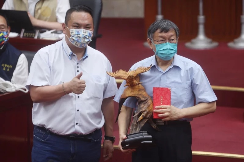 台北市議會9月12日進行市政總質詢,台北市長柯文哲(右)赴議會備詢,市議員陳重文(左)在他任內最後一次總質詢,送上展翅高飛的老鷹木雕,祝柯卸任後「鵬程萬里」。圖/許正宏攝影