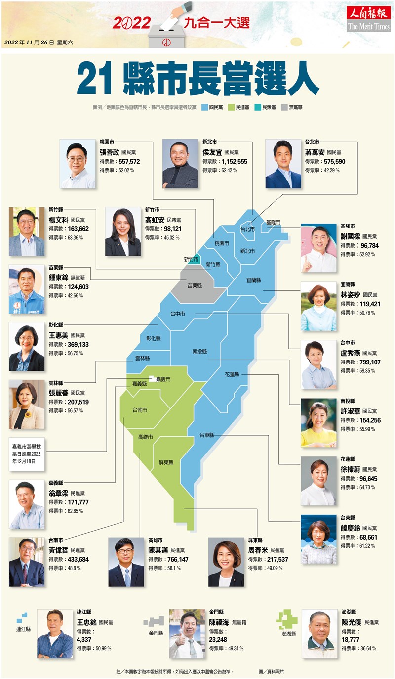 【本報綜合報導】九合一選舉今天投開票,這場儼然成為台灣版「期中選舉」的大選,不但攸關地方執政權,更被視為2024年總統大選前哨戰。如今九合一選舉落幕,全台當選結果名單出爐,國民黨睽違8年,台北市、桃園市藍天再現,達成黨主席朱立倫六都過半的目標。