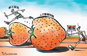 目前企業界大都是四、五年級在當家,後面卻人才大斷層,多數是不能受壓的草莓族,由於斷層不斷地擴大,企業把總部設在上海、孟買,好運用當地的優秀人才,台灣的青年還沒準備好,只有讓老人照勞基新法延後退休五年。