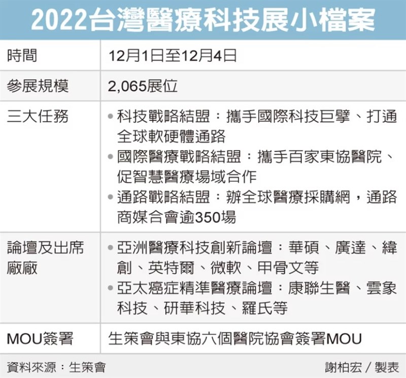 生策會27日表示,今年醫療科技展將聚焦三大關鍵任務。第一是科技戰略結盟:包括微軟、甲骨文等國際大廠將來台探討與台灣醫院合作機會,目標是共同打造新世代智慧醫院。此外,華碩、廣達、緯創等科技廠共同參與「亞洲醫療科技創新論壇」,由華碩董事長施崇棠進行專題演講,目的是要尋找台灣研發、具潛力醫療軟體,讓數位創新應用連結大廠的關鍵元件,載入數位醫療應用,最後促成台灣先進醫療軟體銷售海外。