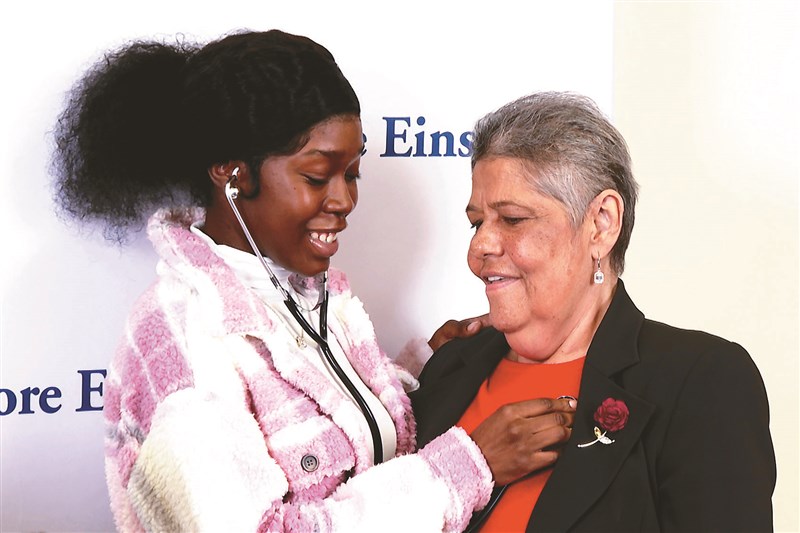 接受布瑞塔妮心臟移植的尼維斯(右),二十二日見到捐贈器官的牛頓家人,布瑞塔妮的妹妹布里妮拿著聽診器聆聽姐姐的心跳聲。圖/美聯社