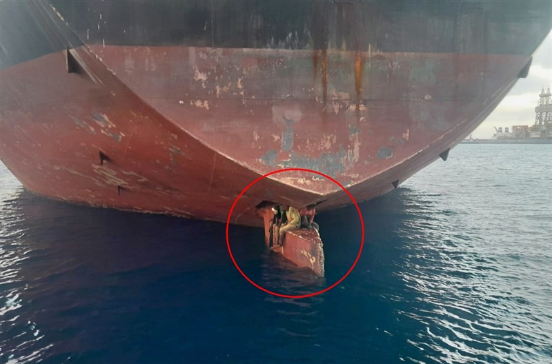【本報綜合外電報導】西班牙海岸警衛隊近日在一艘從奈及利亞出發、抵達西班牙加納利群島的船上找到3名偷渡客,值得注意的是,發布的照片可以見到這3人竟躲在貨輪「船舵和船體之間的空隙」。