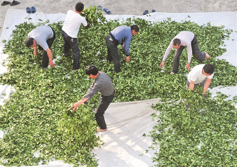 圖為福建安溪茶農們,將製作鐵觀音的春茶進行晒青加工。