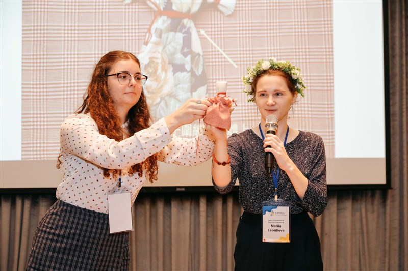 烏克蘭學生帶領來賓現場製作代表烏克蘭傳統幸運護身符的娃娃Motanka Doll。圖/陽明交大提供