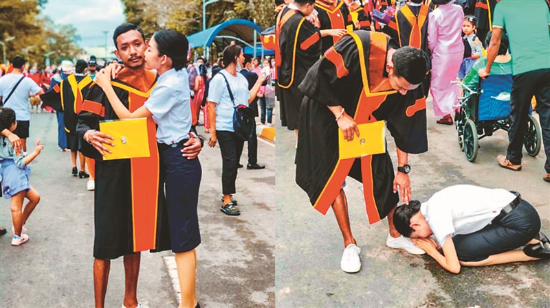 泰國一所大學舉辦畢業典禮,一名女畢業生對哥哥下跪行禮,感謝哥哥供她念書。