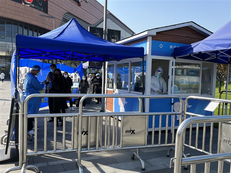 上海市疫情防控單位放寬防疫要求,搭乘地鐵、進入商場不再需要查驗核酸檢測陰性證明,常態化核酸檢測小亭前卻仍有民眾排隊等待採樣,原因包括前往餐廳仍必須持有48小時核酸檢測證明。圖/中央社