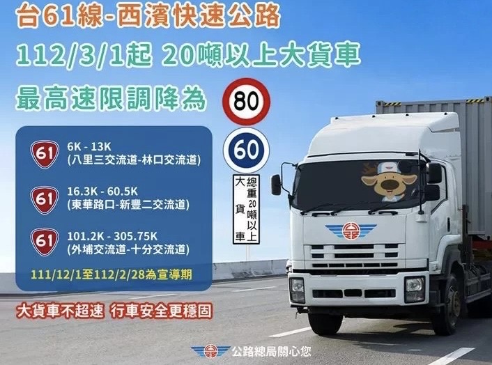 公路總局為提升大貨車行駛台61線安全,針對超速、超載及貨物掉落等問題規畫短中期作為,部分路段最高速限從每小時90公里調降為每小時80公里,包括台61線八里三交流道至林口交流道、台61線的柬華路口至新豐二交流道等。