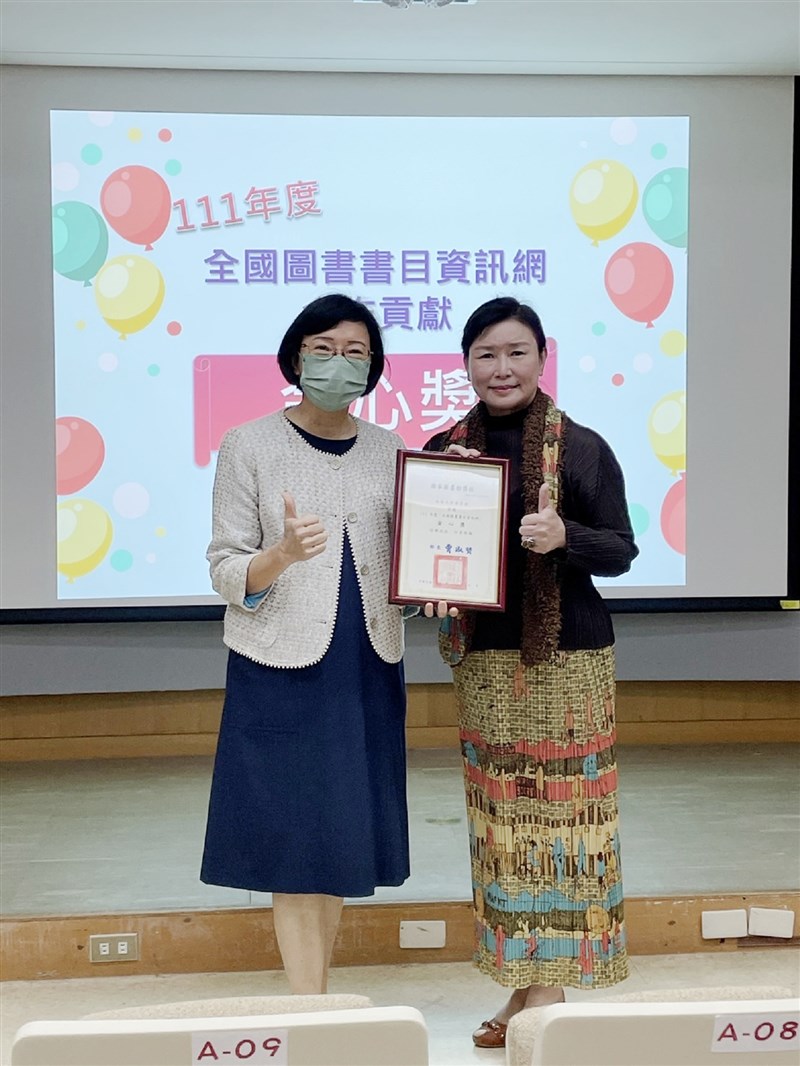 南華大學連續三年獲頒全國圖書書目資訊網「金心獎」,賴淑玲(右)代表學校接受表揚。圖/南華大學提供