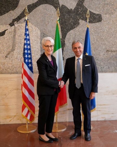 美國副國務卿雪蔓(左)與義大利外交部秘書長謝國宜(右)舉行會談。圖/取自推特帳號DeputySecState