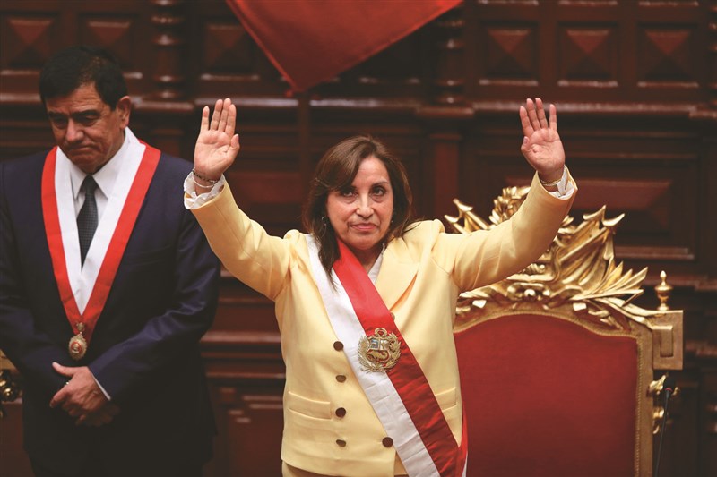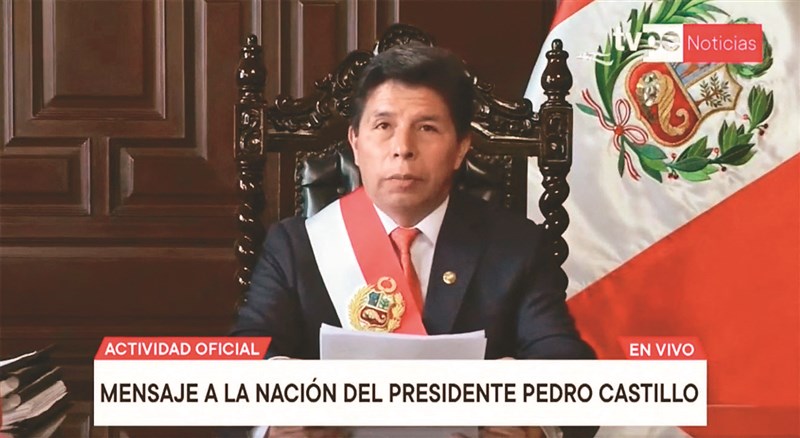 【本報綜合外電報導】秘魯總統卡斯蒂約(Pedro Castillo)想解散國會,一手掌控行政立法兩權,反被國會罷黜,副總統博魯阿爾特(Dina Boluarte)七日宣誓接任,成為秘魯史上第一位女總統。這場憲政危機起自國會彈劾總統,卡斯蒂約為了阻止國會就彈劾案進行票決,宣告解散國會。