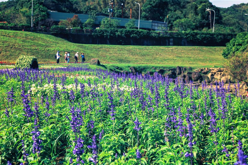 紫色的鼠尾草在綠油油的草坡點綴花海。圖/北市水利處提供