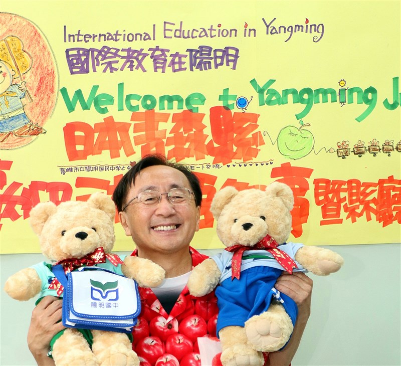 歡迎青森縣訪團,陽明國中安排學生薩克斯風迎賓,同學還以英日文致詞歡迎,高雄市教育局長謝文斌也出席共聚一堂。