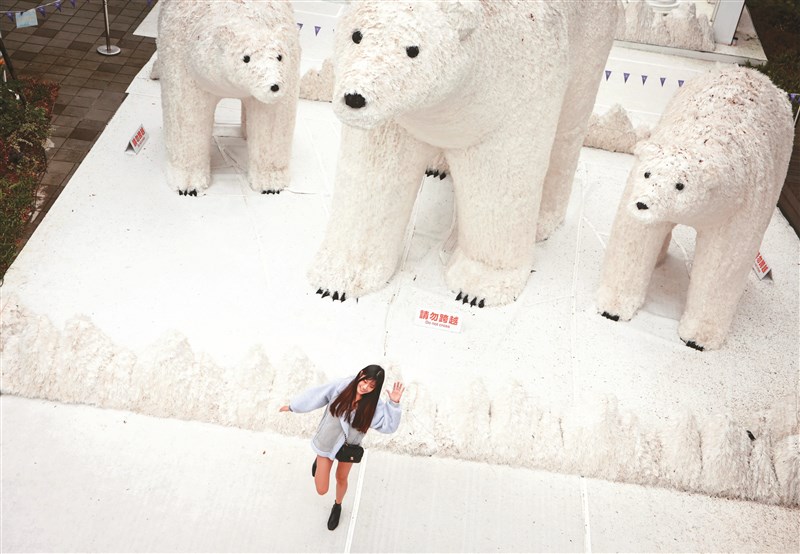 寒冬將至,二○二二新北歡樂耶誕城展出大型北極熊裝置藝術應景,吸引民眾與雪白背景合影。圖/中央社