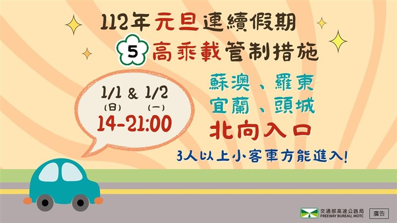 高速公路局預期國道將湧入大量車潮,2023年1月1日至2日下午2點至晚上9點實施國道5號北向高乘載管制疏導措施。圖/高公局提供