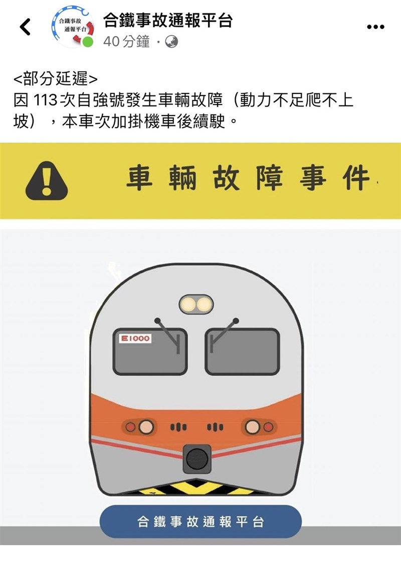 台鐵113次自強號今天中午行駛苗栗至南勢站間,發生後端機車VCB跳開故障,導致列車延誤。圖/取自臉書「合鐵事故通報平台」