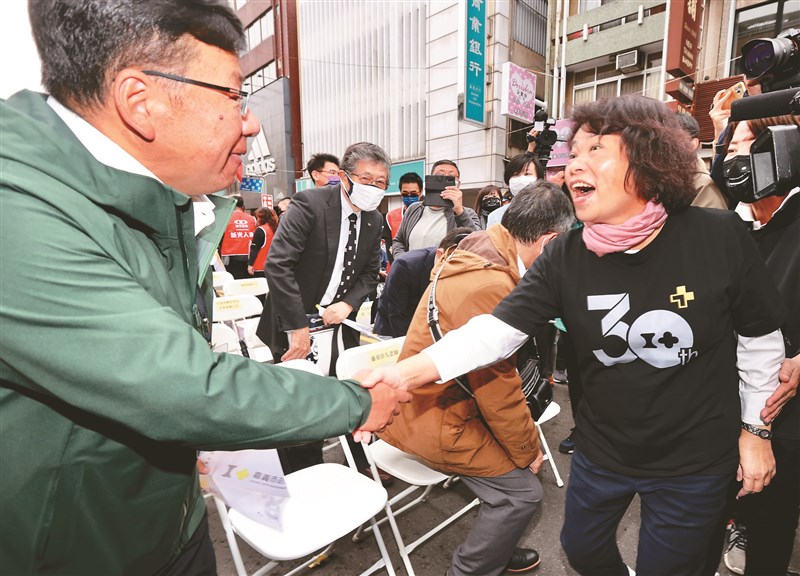 國民兩黨嘉義市長候選人黃敏惠(右)、李俊俋(左)同場參與國際管樂節,握手致意。圖/許正宏