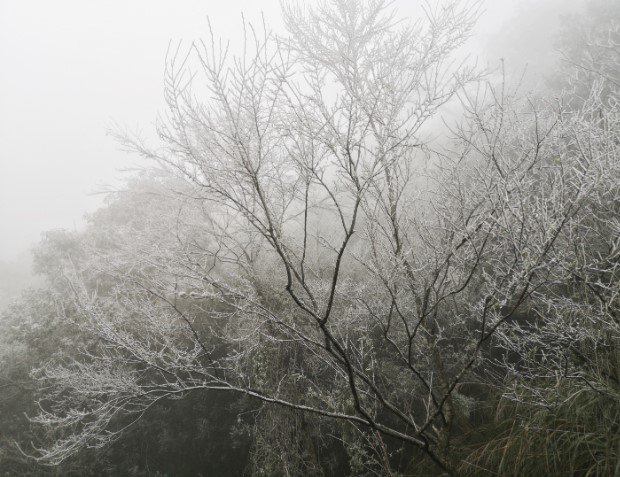 寒流來襲,平地許多地方氣溫都只有個位數,新竹尖石鄉 120縣道的迎風面魯壁地區,路邊的路樹結了霧淞。圖/邱德祥