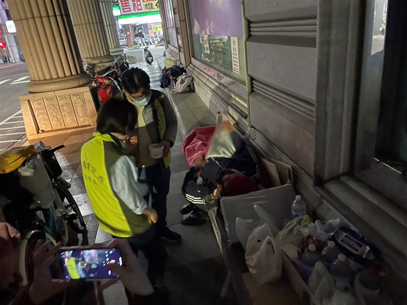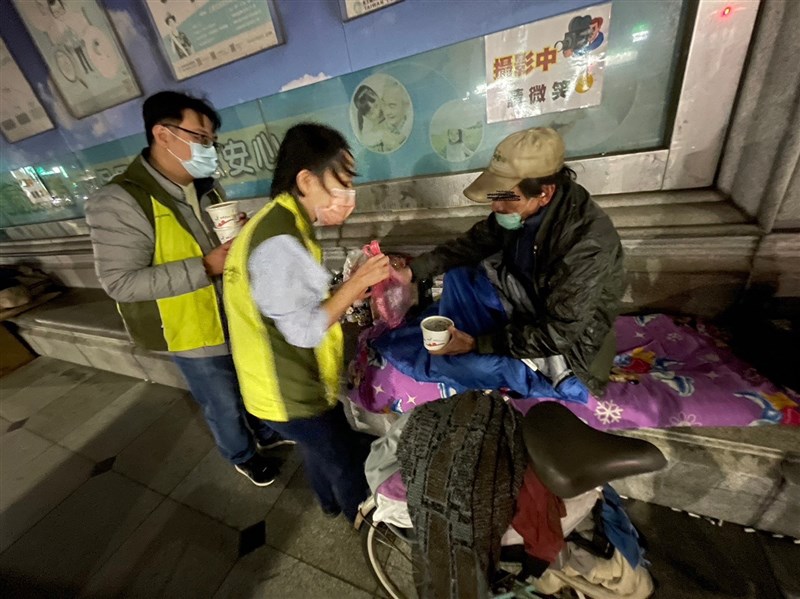 為免街友受凍挨餓,社會局近日派員分送衣物睡袋,鼓勵他們入住街友中心,也有人到合約旅館洗熱水澡等。