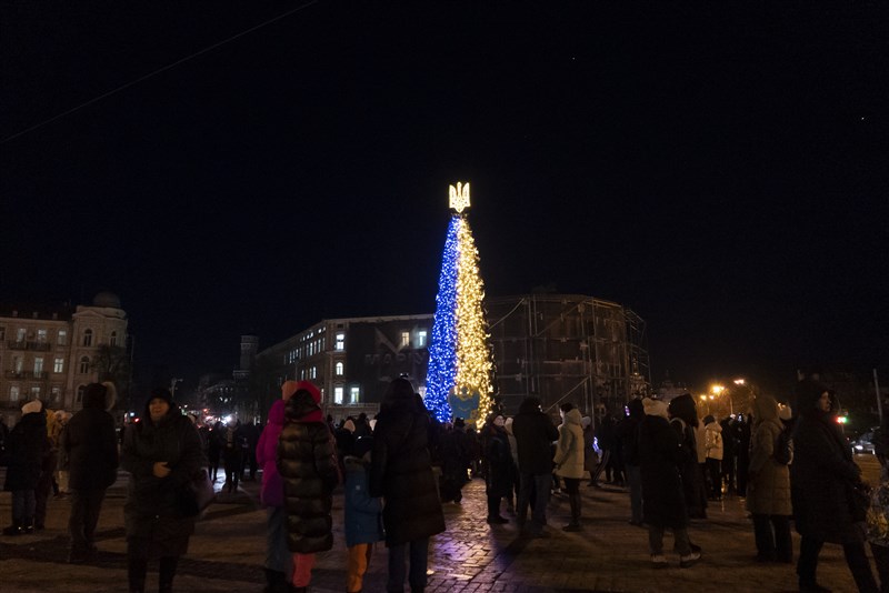 法新社報導,基輔豎起一顆12公尺高的人造耶誕樹,上頭裝飾著象徵和平的白鴿,樹頂則是烏克蘭國徽三叉戟。與此同時,俄羅斯仍持續發動攻擊,猛轟基輔和其周遭的關鍵基礎設施。