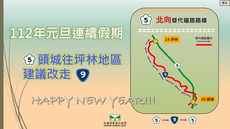 高公局表示,依大數據資料分析研判,元旦連假前一日(12月30日)上午9時至凌晨0時、連假首日(12月31日)上午5時至下午4時、連假次日(1月1日)上午6時至下午3時國5南向南港系統至頭城;連假次日(1月1日)上午11時至凌晨0時及收假日(1月2日)上午9時至晚上8時國5北向宜蘭至坪林等路段,車速將低於每小時40公里,行車時間恐將為平常的5至7倍,建議南向改走台9線或106乙、北向建議改走台9線,以避開壅塞車潮。
