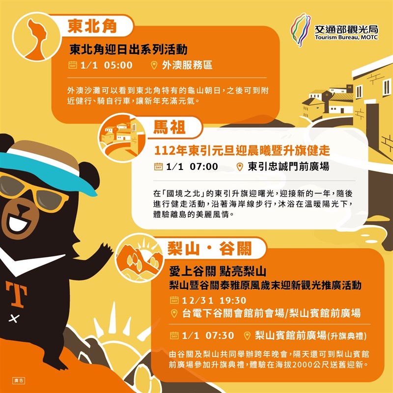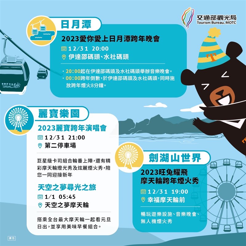 倒數10天迎2023年 11大跨年、迎曙光活動看這裡 |2022.12.20 語音朗讀 1058觀看次 字級 大 中 小 麗寶樂園跨年晚會,將帶來330秒高密度環狀璀璨煙火,搭陪摩天輪燈光秀,迎接新年。圖╱中央社 【本報台北訊】2022年最後倒數10天,交通部觀光局表示,跨年夜各地訂房率已達5成以上,今年有5大國家風景區、3個主題樂園,共11項跨年、迎曙光活動,包括義大世界長達999秒大型立體藝術煙火秀、阿里山1314觀景平台茶園迎曙光、麗寶樂園天空之夢結合煙火及無人機燈光秀等。觀光局表示,今年跨年及迎曙光活動遍布北中南及離島地區,東部地區受天候影響有多年沒看到第一道曙光,今年罕見未提報活動,民眾仍可自行前往碰運氣。12月31日梨山、谷關、日月潭等都有跨年晚會、煙火秀;麗寶樂園、劍湖山世界、義大世界等也有煙火秀、跨年演唱會等。阿里山日出美景,每年元旦都吸引許多遊客上山迎接第一道曙光。圖╱中央社觀光局國旅組長莊靜真指出,北部民眾元旦可到宜蘭外澳參加「東北角迎日出系列活動」,結合音樂會迎接東北角特有的龜山朝日,之後可到附近健行、騎自行車、參加限量微笑餐桌,身心舒暢迎新年。莊靜真表示,中部民眾可前往谷關、梨山參加跨年晚會,隔天還可到梨山賓館參加升旗典禮,體驗在海拔2千公尺迎新送舊。日月潭伊達邵碼頭跨年日當天中午就有特色市集展出,晚間在水社、伊達邵碼頭前施放480秒兩岸雙煙火;麗寶樂園也找來巨星卡司輪番上陣,不僅「天空之夢尋光之旅」在跨年夜的摩天輪燈光秀及煙火秀,隔天還可搭乘摩天輪看日出,限量120人次,已銷售5成。高雄年底跨年活動多,亞灣區周圍的旅館訂房率破8成。圖╱中央社她也說,南部民眾有「阿里山日出印象音樂會」,以玉山及日出雲海為背景,欣賞原住民天籟及悠揚的管絃樂,或是到私房景點梅山鄉「隅夷處·耀瑞峰」朝聖,在1314觀景平台以茶園為前景擁抱第一道日出。劍湖山世界不僅有摩天輪跨年煙火秀,今年還有數百台無人機結合的燈光秀。義大世界則有長達999秒大型立體藝術煙火秀。另外,離島部分,民眾可選擇到「國境之北」的馬祖東引升旗,迎接國境曙光,隨後參加健行活動,沿著海岸線漫旅馬祖,體驗離島風情。相關活動資訊可洽相關國家風景區管理處及遊樂園網站查詢。圖╱觀光局提供 前一篇文章 照顧小嬰兒 醫生建議同室不同床以避免壓到 下一篇文章 新《不可能的任務》 阿湯哥練500次跳傘、1萬多次機車跳躍 熱門新聞 01桌球年終賽激戰 林昀儒力爭晉4強2025.12.1202【研朱札記】 臺灣第一本訪碑專著 《北臺灣之古碑》與石坂文庫2025.12.1103傳燈60.百年仰望紀念郵票 明年3月發行2025.12.0904泰國合艾水災 佛光山送暖助復原2025.12.1105【人間行路】迷路的異鄉人 2025.12.0906佛光山人間大學新馬分校 結業展示所學2025.12.1007洗衣公車 助街友找回自信2025.12.0908光明大學宿霧藝術學院 三好音樂劇放光采2025.12.1109冰雪夜綻佛光 西來寺響應哈崗親子嘉年華2025.12.0910多倫多佛光山 佛光人行佛精進獲獎2025.12.11 訂閱電子報 台北市 天氣預報 台灣一週天氣預報 相關報導 綠美圖 現代感十足月眉溼地 賞落羽松28隻救難犬榮退 獲頒獎章屏東看海美術館 今年50萬人次造訪宜蘭映像節 光影交織友愛接力 送騎車券