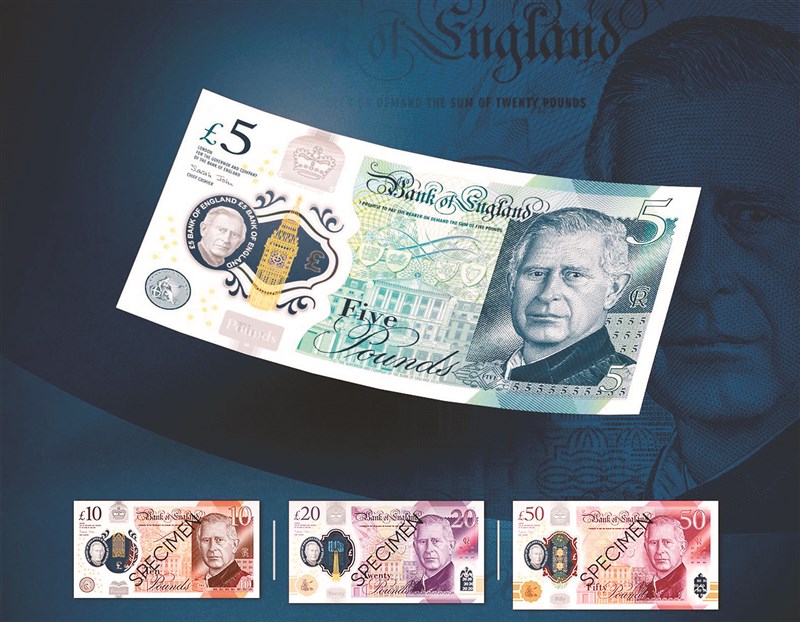 英國央行英格蘭銀行(Bank of England)19日公布新版鈔票設計時表示,首批印有國王查理三世(King Charles III)肖像的鈔票,將於2024年年中開始流通。