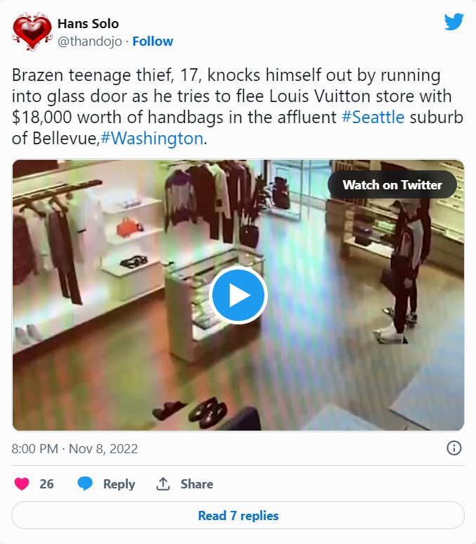 玻璃門太乾淨 搶匪撞昏頭被捕 |2022.12.21 語音朗讀 952觀看次 字級 大 中 小 【本報綜合外電報導】福斯新聞報導,美國華盛頓州一名男子來到精品「路易威登」(LV)的分店行竊,當他拿著贓物想逃跑時卻一頭撞上門口「擦得太乾淨」的玻璃,最後更在昏倒的情況下被直接逮捕。這名年僅十七歲的搶匪選在貝爾維尤(Bellevue)一家LV分店行竊,警方表示他試圖搶走價值一點八萬美元(約新台幣五十七點四萬元)的手提包,當他想衝出商店逃跑時,卻沒注意到玻璃門根本沒打開,就這樣一頭撞上、整個人瞬間倒地,保全也趕緊上前處理這一事件。 前一篇文章 165年沉船內牛仔褲 344萬賣出 下一篇文章 世界5大高空觀景台 賞景練膽量 熱門新聞 01南華大學茶禪雅集 靜坐書寫時光膠囊2026.03.2602星雲大師靈骨分燈歐洲 傳燈萬方2026.03.2603佛光山365日越文版 贈西貢日航大酒店2026.03.2704紅綠葡萄抗氧化抗發炎 連皮吃獲取健康全效益2026.03.2705台灣工藝3專書 呈現文化獨特樣貌2026.03.2706中職37年 明大巨蛋開幕戰2026.03.2707兒童節禮物 新北學生自己票選2026.03.2608北京中學老師 精準預言美伊開戰2026.03.2609全球首例 菲國進入能源緊急狀態2026.03.2610滑雪勝地轉型 數位遊牧族進駐2026.03.26 訂閱電子報 台北市 天氣預報 台灣一週天氣預報 相關報導 昆蟲學教授 以寶可夢命名新物種創意認養 換狗狗挑選心儀主人買菜發現小草條碼 網友讚巧思超市設聊天收銀台 慢結帳撫慰孤獨重拾身心活力 星國長者瘋跑酷10年前人鏈救狗 化作哈薩克雕像