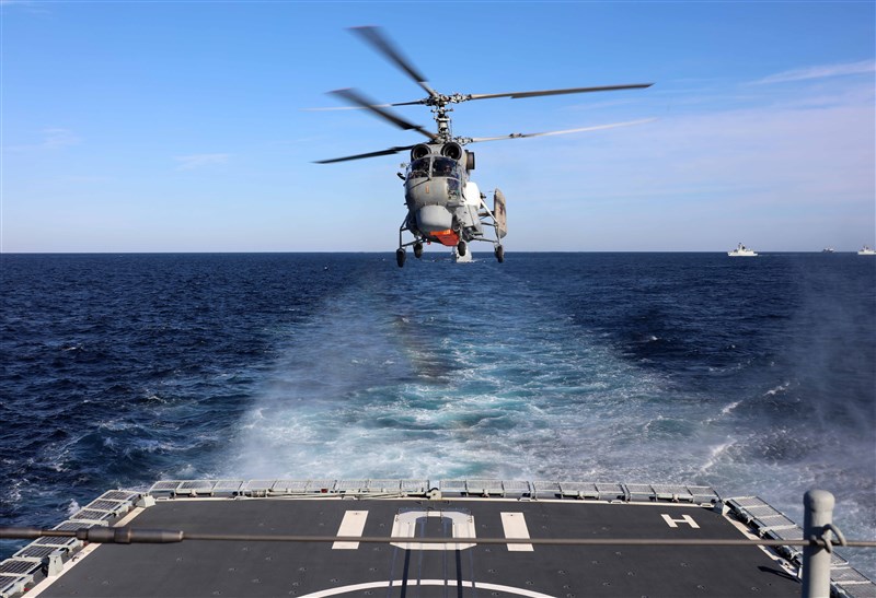 共軍與俄軍舉辦海上聯合軍演已有多年。圖為2021年軍演時,俄羅斯艦載直升機飛臨共軍海軍「南昌艦」進行模擬著艦演練。圖/新華社