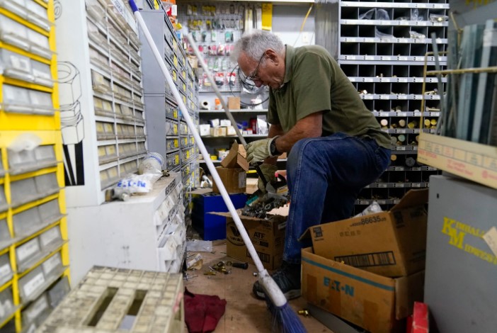 一位先生正在清理因為地震而散落的汽車零件。圖/美聯社