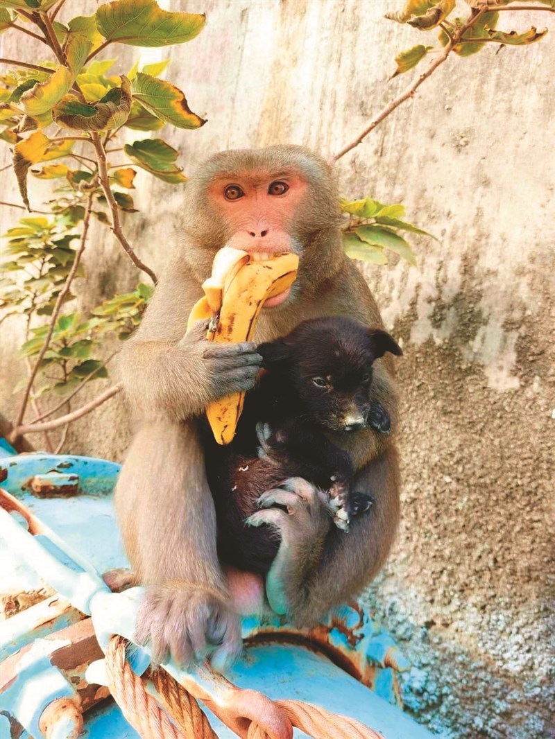 獼猴抱小黑狗餵食照顧,鄉民求情勿拆散。圖/成峻提供
