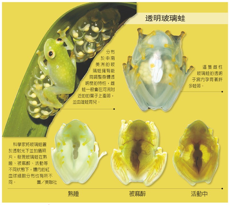 透明玻璃蛙 |2022.12.24 語音朗讀 802觀看次 字級 大 中 小 分布於中南美洲的玻璃蛙擁有能夠調整身體透明度的特性,雌蛙一般會在河流附近的的葉子上產卵,並由雄蛙育兒。 科學家將玻璃蛙置於透射光下並拍攝照片,發現玻璃蛙在熟睡、被麻醉、活動等不同狀態下,體內的紅血球細胞分布也有所不同。圖/美聯社 分布於中南美洲的玻璃蛙擁有能夠調整身體透明度的特性,雌蛙一般會在河流附近的的葉子上產卵,並由雄蛙育兒。科學家將玻璃蛙置於透射光下並拍攝照片,發現玻璃蛙在熟睡、被麻醉、活動等不同狀態下,體內的紅血球細胞分布也有所不同。圖/美聯社 前一篇文章 年歲增智慧? 學者:洞察力與年紀無關 下一篇文章 中美熱線 美:捐疫苗 陸:勿踩紅線 熱門新聞 01【詩】遊園地.競馬場2025.11.1702渥太華佛光山 授海狸童軍領巾2025.11.1703【經典新話】歸亞蕾 超越世代傳奇影后2025.11.1504【營養專欄】掌握五原則 輕鬆控糖2025.11.1505落葉刺繡 巴西百鳥寫真集2025.11.1706【海闊天空】濟州島旅記 解鎖美景美食2025.11.1507星雲大師全集⑲【佛教管理學②】禪門的管理法⑨2025.11.1508警告日本 陸黃海軍演、籲暫勿遊日 2025.11.1609法華禪寺 彩繪燈籠2025.11.1510川普第2任期 首軍售台102億2025.11.15 訂閱電子報 台北市 天氣預報 台灣一週天氣預報 相關報導 沙國王儲訪白宮 允投資美31兆元COP30首份草案 重啟化石燃料戰場澤倫斯基訪西班牙 獲援助300億元李強再會俄總理:願深化各領域合作美版加薩20點計畫 安理會通過中德財金對話聚焦稀土 達27項共識