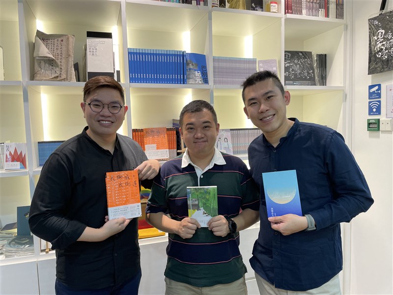新加坡青年汪來昇(左)與夥伴們一同創立「新文潮出版社」,主要出版繁體書,盼牽起星、台、港之間的文學交流。圖/中央社