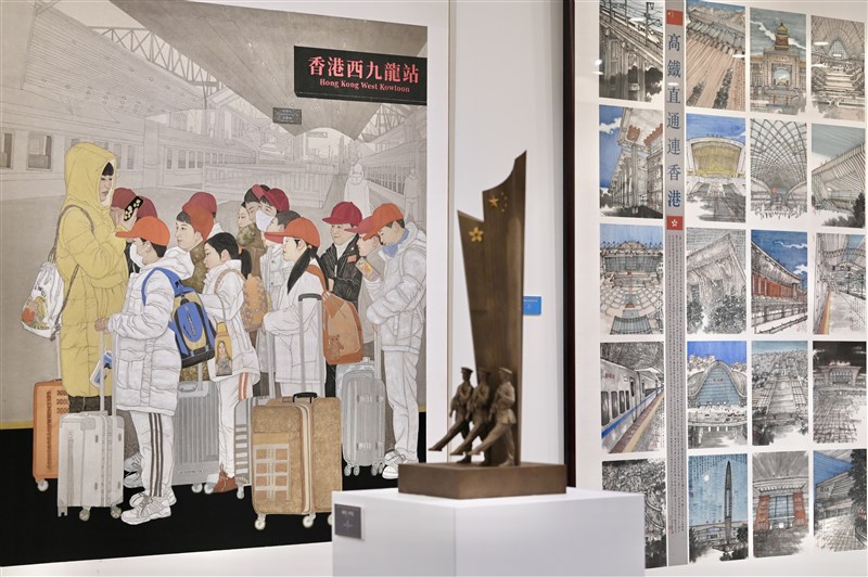 香港西九龍高鐵站為通關作準備,圖為關於香港高鐵通車題材的美術作品。圖╱中新社