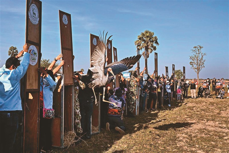 【本報綜合外電報導】十三隻泰國東方沙魯斯鶴,日前在泰國東北部一處水庫上空野放,孩童和圍觀的民眾見證歡呼,這些巨大的禽鳥大聲鳴叫,搖搖晃晃地飛向天空;這是泰國為復育這種幾近滅絕的物種所付出的最新努力。