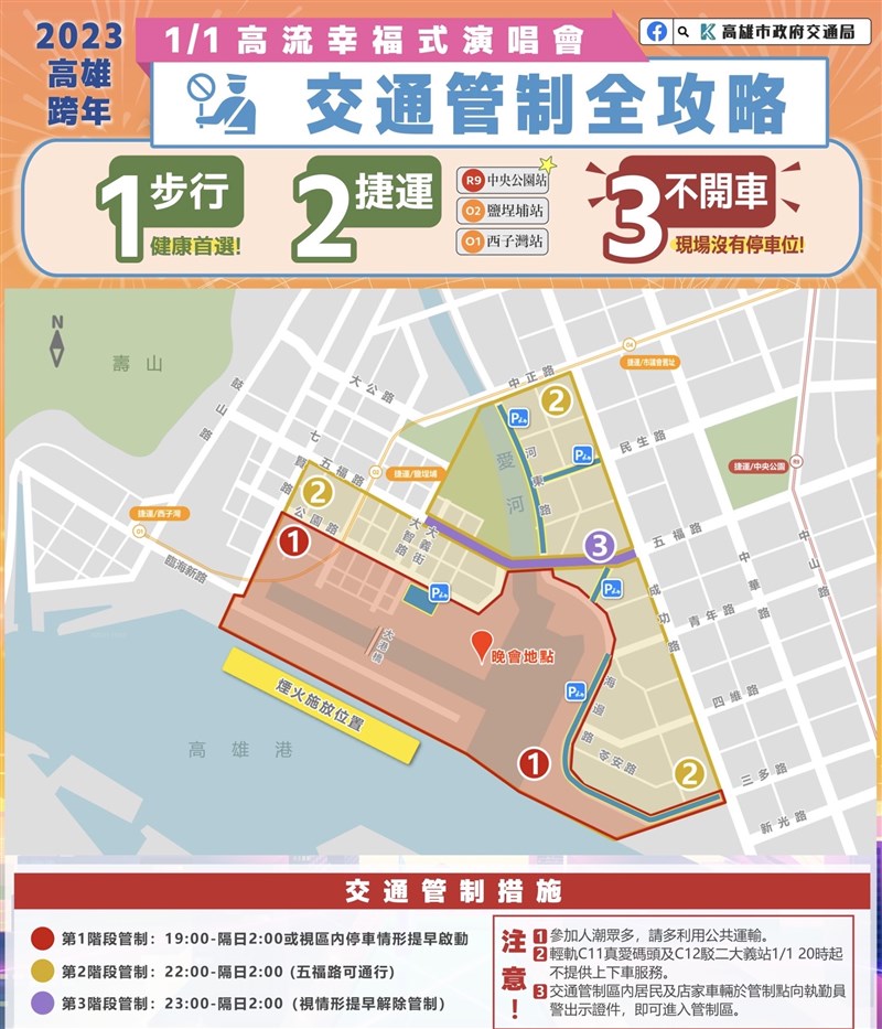 【記者王淑芬高雄報導】迎接2023高雄跨年跨,為疏運龐大人潮,高市府鼓勵民眾搭乘捷運,班距加密到3至6分鐘,末班車延長至次日凌晨2時發車。31日夢時代《亞灣未來市演唱會》捷運凱旋站3號出口即會場,元旦《高流幸福式演唱會》鄰中央公園,建議利用捷運提早前往。