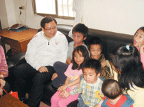 第一眼看到宗媽媽時,七個小孩正圍繞著她,一看到來訪的客人時,小朋友立即跑過去牽著吳執行長的手,熱情的大喊「吳志揚、五隻羊」,真是活潑可愛。(圖/伯仲文教基金會提供)