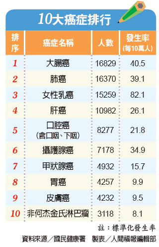 綜觀10大癌症發生人數(男女合計),大腸癌以確診人數多達1萬6829人居首,其次依序為肺癌、女性乳癌、肝癌、口腔癌(含口咽、下咽)、攝護腺癌、甲狀腺癌、胃癌、皮膚癌、非何杰金氏淋巴瘤。除了胃癌與皮膚癌、子宮體癌與非何杰金氏淋巴瘤序位互換,其餘排序與2019年相同。