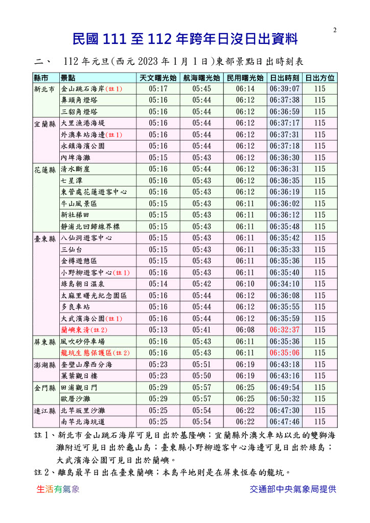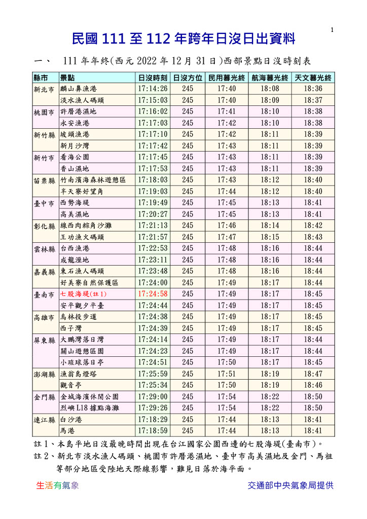 2022全台最後的日落在這裡 雲量多難見曙光 |2022.12.31 語音朗讀 1280觀看次 字級 大 中 小 圖/周銀王提供 【本報台北訊】今天就是2022最後一天,氣象局長鄭明典表示,根據美國海軍天文台的軟體計算,今年台灣平地最晚日沒地方是台南市西邊的七股海堤,為傍晚5時24分58秒。氣象局表示,明年元旦全台最早日出在台東蘭嶼,本島平地則是屏東恆春龍坑生態保護區,但北部及東半部雲量多,甚至有飄雨機率,因此看到首道曙光的機率非常低。除了追新年第一道曙光,不少人也會朝聖今年最後一道日落。氣象局表示,今天本島平地日沒最晚時間在台南市台江國家公園西邊的七股海堤。另外,新北市淡水漁人碼頭、桃園市許厝港濕地、台中市高美濕地及金門、馬祖等部分地區也是民眾觀賞日落熱門景點,但受陸地天際線影響,則難見日落於海平面。氣象局表示,今天受東北季風影響水氣增加,北部地區迎風面飄雨,中南部地區仍有觀賞到今年最後一道日落的機會。圖/取自報天文 - 中央氣象局臉書圖/取自報天文 - 中央氣象局臉書 前一篇文章 2023年致護法朋友們的一封信 下一篇文章 蔡英文召開國安高層會議 決定稅課超收分配面向 熱門新聞 01秋節送暖 佛光人進光復祝福2025.10.0902三好校園化身賑災物資中心 菲師生協助包裝2025.10.0903VEGRUN正念路跑 法寶寺攜手竹市府2025.10.0904三代喜同堂 永和學舍重陽敬老2025.10.0805自由女神與超級月亮2025.10.0806陳俊吉將繁花變佛身 法寶寺膠彩佛畫個展2025.10.0807【佛門攬勝】中川第一禪林:四川綿陽聖水寺2025.10.0808諾貝爾物理獎 英法美3學者共享2025.10.0809【翰墨天地】菩薩就在你身邊2025.10.0810連40天超種亮紅燈 高麗菜價恐跌2025.10.08 訂閱電子報 台北市 天氣預報 台灣一週天氣預報 相關報導 藍黨魁選舉北部政見會 鄭:2026翻轉南台灣 郝:南部拿下一都新新併後 T17、18可解約? 法務局:新壽繼受地上權 須北市同意賴總統:加速打造台灣之盾 總統國慶談話 聚焦6大關鍵力國防院台北安全對話 充斥信川論李洋備詢首秀 卓揆幫腔