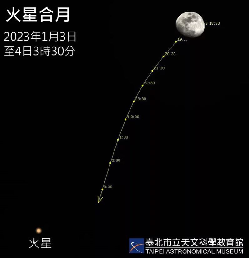 另外,常見的「火星合月」天象當晚也能目睹。台北天文館指出,紅色火星1月3日天黑後,即出現在月球東方約4度處,隨著月球逐漸接近,火星4日凌晨3時30分落下前,兩者角距離近至1度,肉眼所見距離會從4個手指頭,甚至近到只剩一根手指頭。