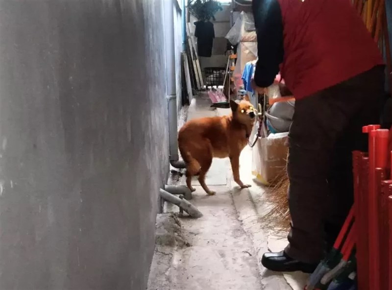 板橋區文翠里內有隻長年在此生活的黃色年邁浪犬「大黃」,個性溫和親人友善,附近的里民、義工及愛爸愛媽長期乾淨餵養及照護大黃。大黃因年事已高,出現弱視、輕微失智。日前動保處接獲通報年邁浪犬疑似脖子被細繩綑綁受困,當日即刻派員救援,板橋動物之家動保員抵達現場時發現大黃被一細繩套住、蜷縮在巷口底,經義工呼喚雖有出來探頭但仍舊無法讓人靠近,動保員當下判斷使用另一牽繩固定大黃身體、義工從旁協助,並請熟識里民持續安撫穩定大黃情緒,大黃在聽到及聞到熟悉的聲音及氣味,慢慢穩定下來,讓動保員可以解除纏在脖子上的細繩。