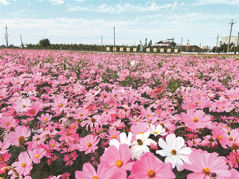 雲林縣莿桐鄉孩沙里花海是全台十大花海景觀之一,七十多位農友無償出借休耕稻田,提供社區種下波斯菊、向日葵及百日草等花種,面積廣達二十五公頃的花海陸續綻放;田園景致繽紛多彩,微風徐徐吹向花蕊,輕輕搖曳,即日起至二月是最佳賞花時節,遊客可把握花期前往。圖為粉紅色波斯菊花海,是孩沙里著名的招牌景色。圖/陳苡葳