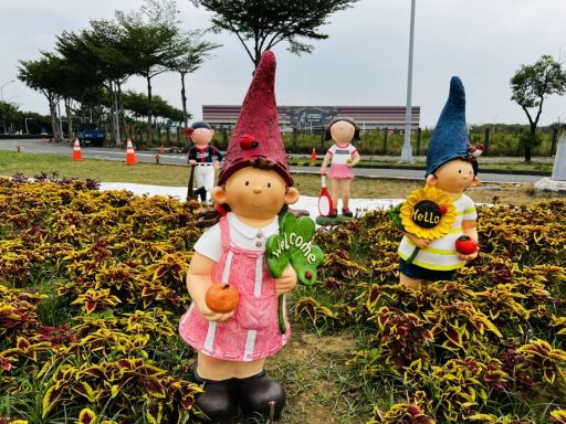 工務局指出,高鐵特定區及大區道南351線,種植3萬4千多株紫花、黃花馬櫻丹、紅花玉芙蓉、金露花等,加上8700株百日花、孔雀草、雞冠花等當季花種,呈現萬紫千紅繽紛色彩;尤其在高鐵大道三角分隔島中,佇立多樣立體人偶,有的手持Hello、Welcome表達歡迎貴客到來,相當可愛。