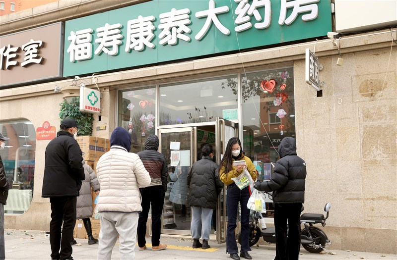 圖為上個月北京一家藥局民眾排隊買藥。圖/中新社