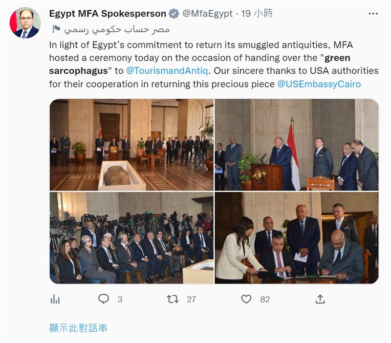 古埃及2700年文物遭走私 美國歸還 |2023.01.03 語音朗讀 975觀看次 字級 大 中 小 埃及宣布尋回一件具有2700年歷史的文物「綠色石棺」,埃及官方表示,這是埃及與美國合作兩年調查成果。圖/法新社 【本報綜合外電報導】埃及昨(2日)宣布追回一個可追溯至近2700年前的石棺蓋,當局表示,這個石棺蓋遭走私出境後,在美國一間博物館展出。法新社和美國有線電視新聞網(CNN)報導,埃及外交部長蘇克里(Sameh Shoukry)在電視轉播的記者會中,宣布尋回這件被稱為「綠色石棺」(Green Sarcophagus)的文物。他說,這個石棺蓋曾被悄悄走私出境,此次尋回是「保護埃及遺產」努力的一環。埃及旅遊及文物部長伊薩(Ahmed Issa)在記者會上說,這個石棺蓋長近3公尺、寬90公分,是最近從美國手中收回的17件文物之一。據官方媒體報導,這個石棺蓋在開羅以南的阿布西爾(Abusir)大型墓地遭洗劫後,2008年運往美國,最終在2013年運往休士頓自然科學博物館(Houston Museum of Natural Science)。伊薩補充說,這是埃及與美國當局合作及歷時兩年的調查成果。過去10年,埃及收回了大約2萬9000件遭人以非法手段運至國外的古物。伊薩說,埃及2022年從美國、紐西蘭、法國和其他國家收中收回110多件文物。埃及古物最高委員會(The Supreme Council of Antiquities)祕書長瓦奇瑞(Mostafa Waziri)說,這個石棺蓋的主人可能是某位貴族。瓦奇瑞說,其歷史可追溯到古埃及晚期(Late Period of Ancient Egypt),由於上頭雕刻的臉孔顏色,因此被命名為綠色石棺。他補充說,當年只有棺蓋失竊,因為整座棺木重約500公斤,是古埃及最大的木製石棺之一。圖/美聯社除了最新出土的文物外,埃及在過去兩年還發現300多座石棺和150個青銅小雕像,其中有些歷史可追溯到3000多年前。當局希望這些重大發現,將有助提振埃及至關重要的旅遊業;埃及觀光業在疫情和先前的動蕩後受到重創。埃及外交部推文說:「我們衷心感謝美國當局(與埃及)合作,歸還這件珍貴的文物。」 前一篇文章 大陸現新變異株XBB.1.5 專家憂成新一波高峰 下一篇文章 鄭州富士康產能恢復 已達旺季峰值90%左右 熱門新聞 01【分數之外】看見另一種英文2026.04.0802男子氣概照護員 日本長照新力量2026.04.0503【轉移注意力】往理想中的自己邁進2026.04.0504降雨兩樣情 南部水庫沒解渴2026.04.0605一紙學歷換錢景 美學位價值遭質疑2026.04.0506美課藥品重稅 台灣沒優惠 2026.04.0407租賃車業者違法攬客 觀光署:最高罰200萬元2026.04.0708【深頁凝視】《後院的鳥》凝神注視鳥兒登場2026.04.0509MLB鄧愷威拆彈 守住今井旅美首勝2026.04.0610暴雨狂炸苗栗 災情頻傳 2026.04.05 訂閱電子報 台北市 天氣預報 台灣一週天氣預報 相關報導 德國波昂 櫻花盛放巴拿馬控陸 長和裁決後頻扣船檢查地球在月球後 奇景曝光北韓又射飛彈 拒絕南韓示好葛里爾:中美關係穩定 盼設貿委會寧夏梨花盛開