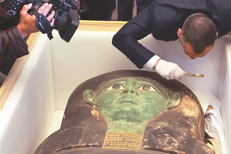 埃及外交部二日在開羅舉行的移交儀式上,埃及古物最高委員會祕書長瓦奇瑞,用放大鏡查看這個又被稱為「綠色石棺」的文物。圖/美聯社